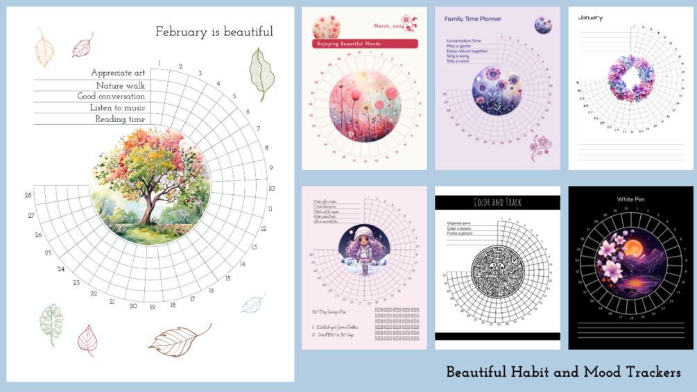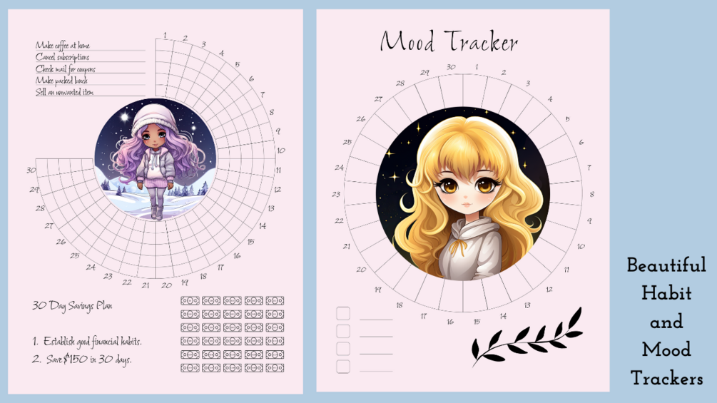 This free bundle includes two TT file with mood and habit tracker designs for 2024 and beyond. The first file includes plain templates. The second demonstrates how these templates can be decorated and includes a sample of our habit tracker filler images which can be purchased on Gumroad separately at this link: https://katharyne.gumroad.com/l/trackerfillers