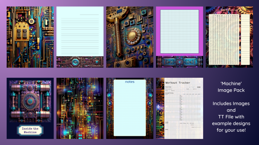 The JPG files are 'Machine' images which include 89 full page inserts, 24 sidebars, 17 panels and 39 header/footer images. These are JUST the Machine images and are designed to be added to your page designs, they do not include the writing paper, workout tracker etc.